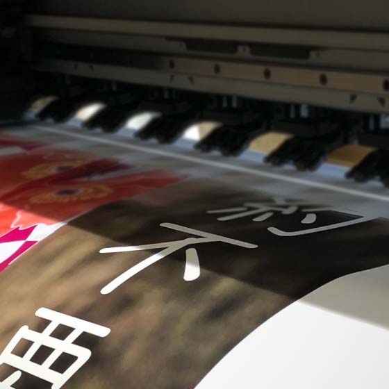 屋外でよく使われるターポリンや塩ビシートなど、防水機能に優れ丈夫なビニール素材にも、鮮やかな色彩を表現できる溶剤プリント。インクがメディアの表面を溶かして色を定着させるため、長期にわたって美しい色合いを保ち続けることが可能です。